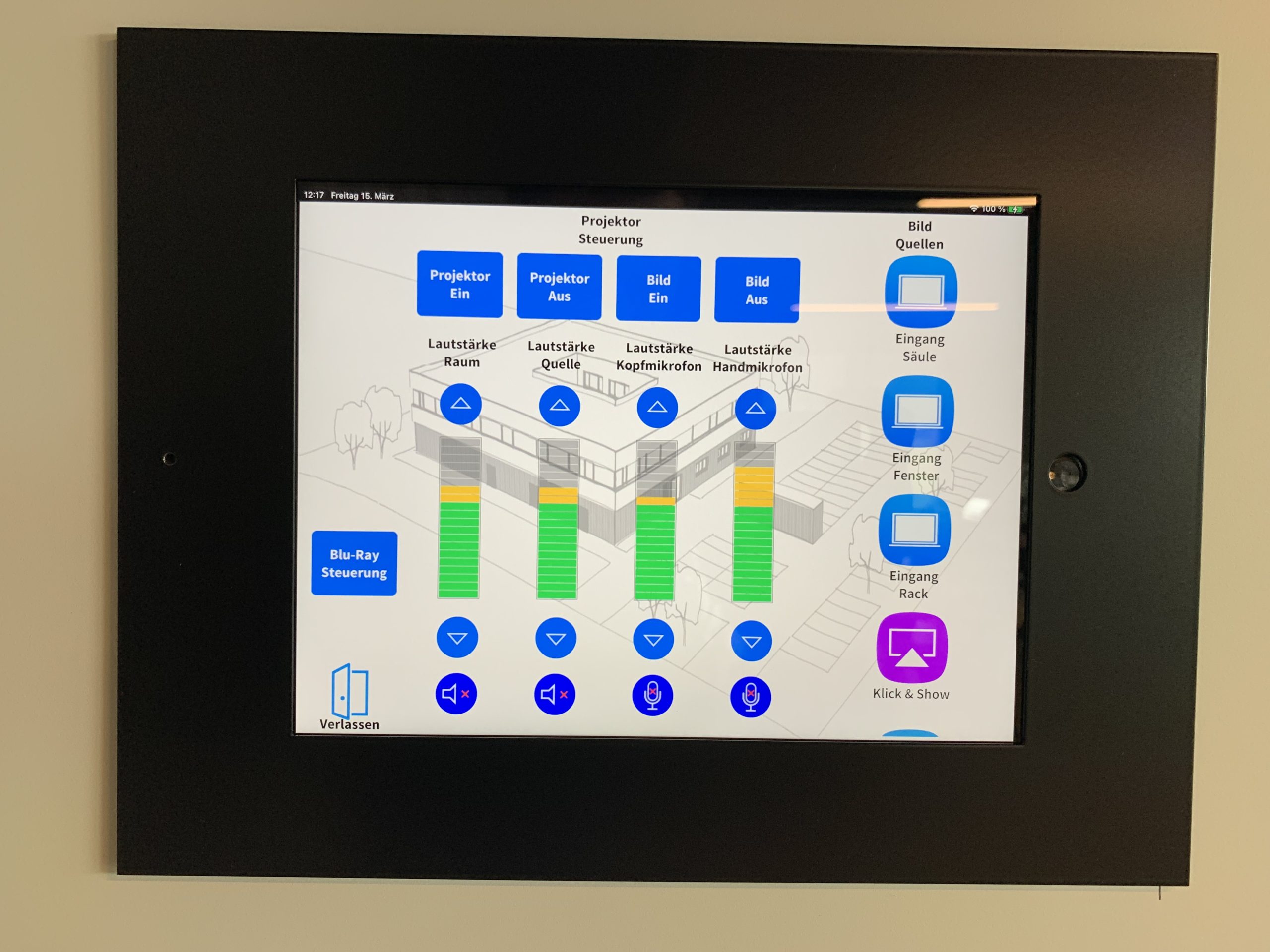 Für die Kantine haben wir einen Projektor mit 5.000 ANSI Lumen von NEC, eine 3,40m breite Leinwand von WS Spalutto, Lautsprecher von Crestron, Mikrofone von Sennheiser und eine Raumsteuerung von Crestron installiert.